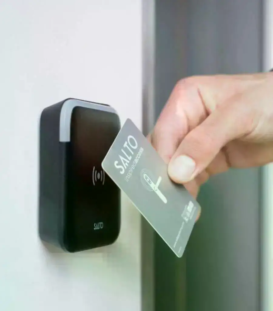 - 2. Card reader: It is a device that reads cards that grant access to people to be verified, and varies between the one that requires card insertion, swipes, or swiping of the card near the reader. The card reader is often installed on or next to the door, the number of which depends on the number of doorways that require restricted access.